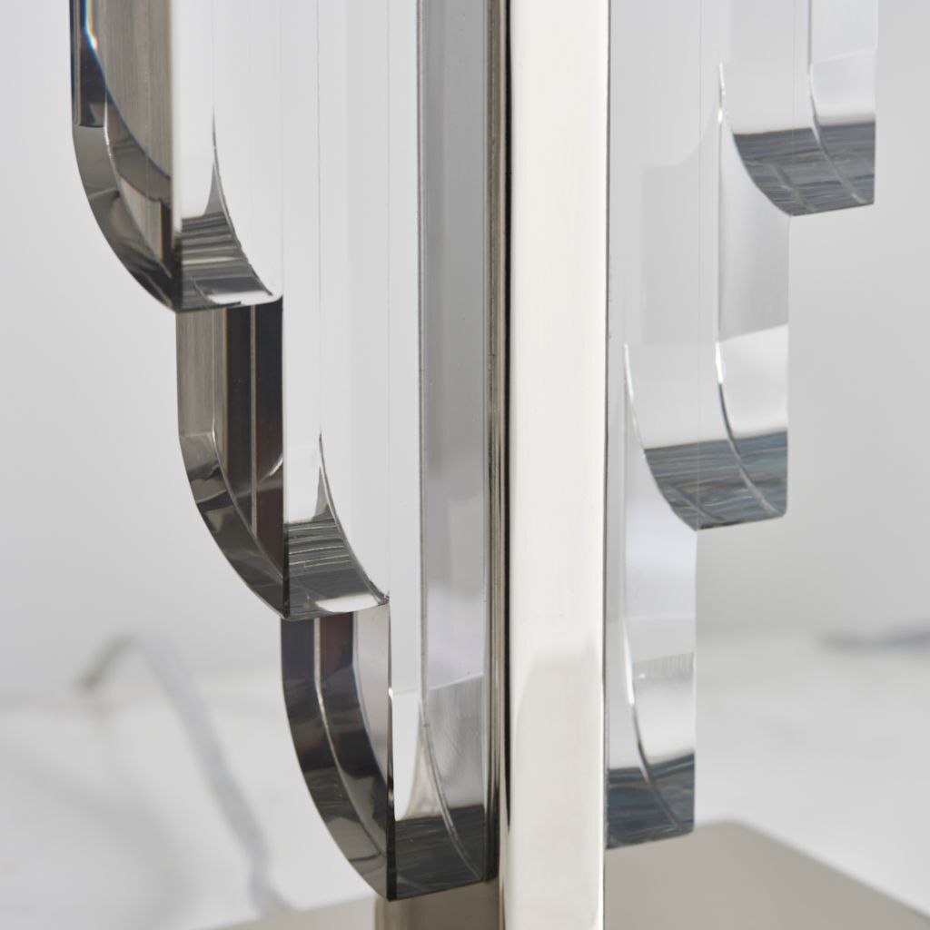 This stunning table lamp features solid crystal bars, elegantly cascading in a stylish Art Deco waterfall design. It’s beautifully complemented by a vintage white faux silk shade, adding a touch of timeless sophistication to any room.